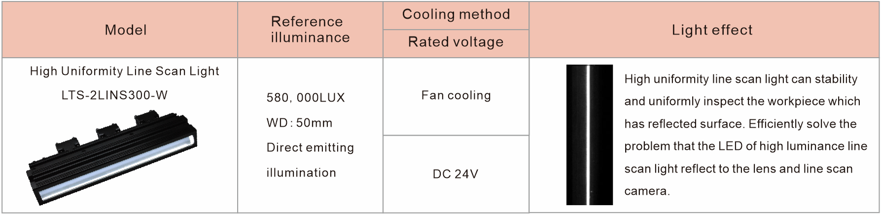 The high uniformity line light is improved on the basis of the high power line light. High-power chip LEDs are adopted and high-uniform diffuser is built in, which effectively solves the problem of uneven illumination. It is applied to occasions of continuous inspection.