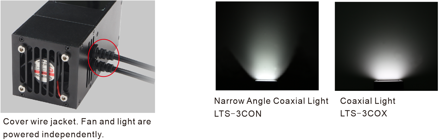 Narrow angle coaxial light add a parallel film on the basis of high power coaxial, to make the emitted light with high parallelism. Can be used in reflective surface inspection.