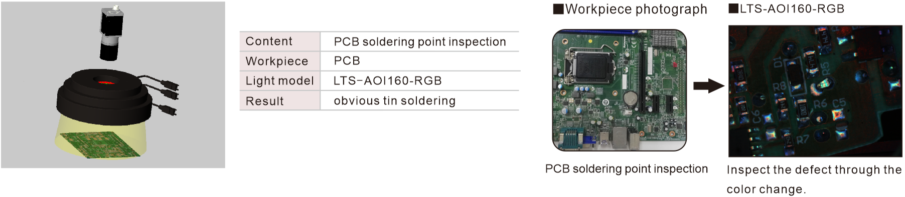 The LED array of AOI light is combined with three colors of red, green and blue. It can illuminate objects in different angles and colors to highlight the 3D information of the object. It specializes in inspection of defects of the PCB boards. It can match with coaxial lights.