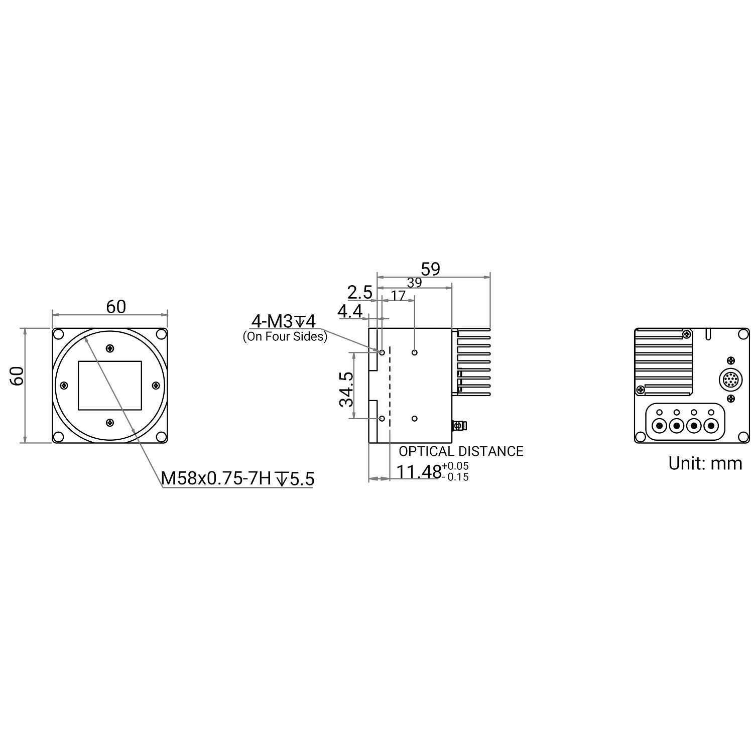 | Mechanical | Lens mount | M58*0.75, flange focal length 11.48 mm (0.5″) |