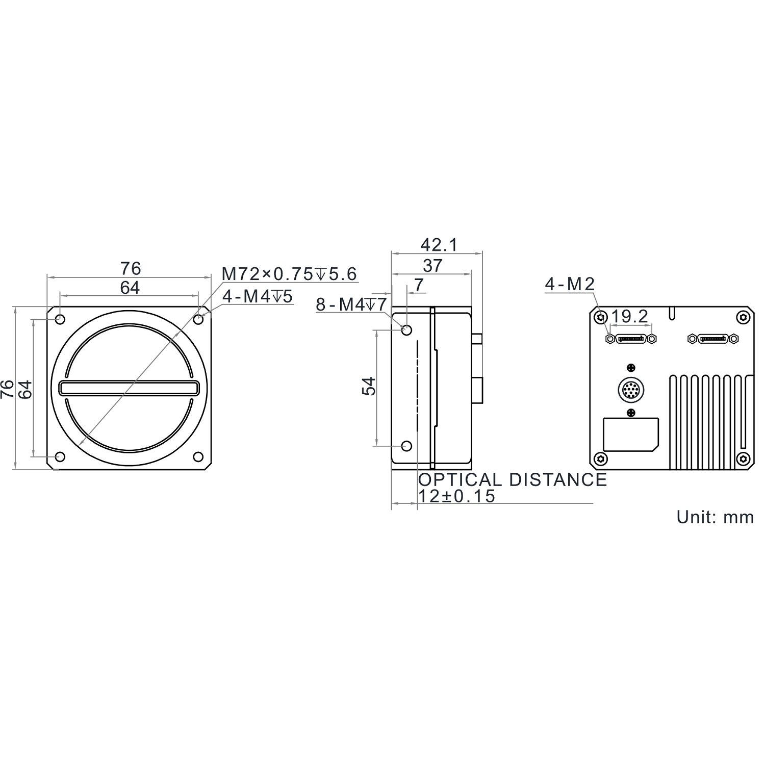 | Mechanical | Lens mount | M72*0.75, optical back focal length: 12 mm (0.5″), applicable to F-mount via lens adapter |